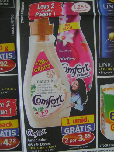 Esta é uma óptima oportunidade para comprar amaciador comfort essencia, leve 2 pague 1, 55 doses, ou seja, na realidade trazemos 110 doses por 3,85€, o que significa que cada dose fica a 0,035€.