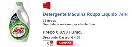 Tenho uma informação (não confirmada) que o MiniPreço tem uma promoção Ariel em pó de 50 doses. Está à venda por €4.99, que se traduz num preço final de €2.99 com o vale de desconto de €2.00 do Para Mim. Ou seja, €0.059/dose.