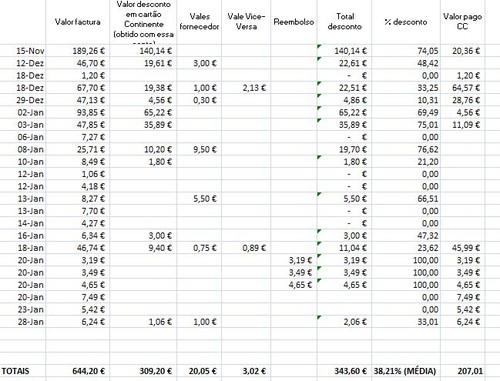 Eu continuo com algumas duvidas em relação ao acumular no cartão. Repara que, tudo bem, conseguiste comprar produtos no valor de 644€ apenas por 207€. Mas a diferença desses valores não tens, exacto? Está no cartão, que mais cedo ou mais tarde vais ter que gastar na mesma no supermercado.... Espero que não interpretes este meu comentário como uma critica, ando a tentar perceber se de facto este sistema vale a pena ou não :)