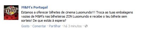 "É simples, basta comprares 2x embalagens M&M’s de 250g; ou 4x embalagens M&M’s de 125g; ou 6x embalagens M&M’s de 45g e entregá-las, vazias, numa bilheteira ZON Lusomundo para receberes o teu bilhete de cinema." M&M´s Portugal